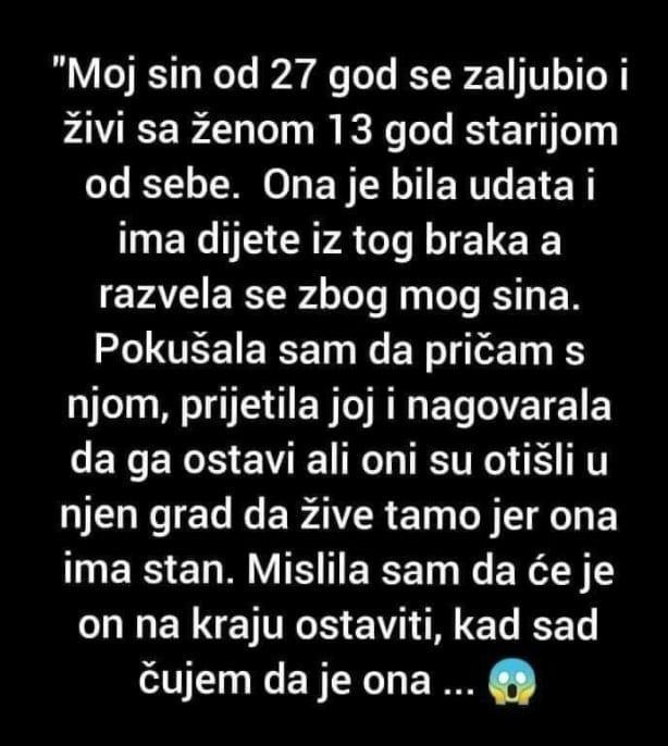 Moj sin od 27 god se zaljubio i živi sa ženom 13 god starijom od sebe.Ona je bila udata i ima dijete iz tog braka a razvela se zbog mog sina. Pokušala sam da pričam s njom, prijetila joj i nagovarala da ga ostavi ali oni su otišli u njen grad da žive tamo jer ona ima stan.Mislila sam da će je on na kraju ostaviti, kad sad čujem da je ona trudna nekoliko mjeseci i rodiće mu dijete. Ne volim je nikako, mlađa je od mene samo 8 god može majka da mu bude.