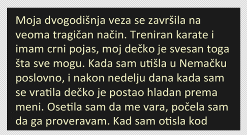 Moja dvogodišnja veza se završila na veoma tragičan način. Treniran karate i imam crni pojas, moj dečko je svesan toga šta sve mogu. Kada sam utišla u Nemačku poslovno, i nakon nedelju dana kada sam se vratila dečko je postao hladan prema meni.