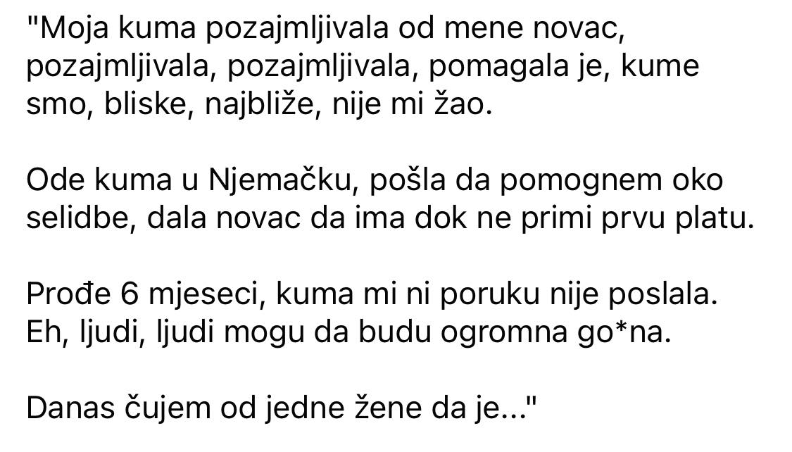 Prođe 6 mjeseci, kuma mi ni poruku nije poslala. Eh, ljudi, ljudi mogu da budu ogromna go*na.Danas čujem od jedne žene da je ogovarala mene i moju familiju stavila ih sve na crnu listu, pa kud ideš živote?Pomogneš mušici da poleti a ona kenja po tebi… žao mi je što sam bila dobra, biću loša od sad svega mi.”