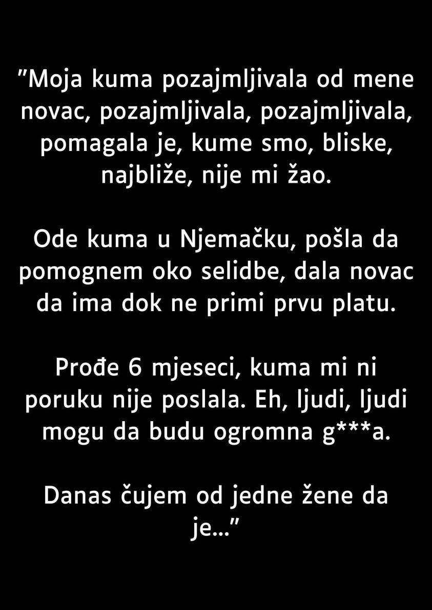 Prođe 6 mjeseci, kuma mi ni poruku nije poslala. Eh, ljudi, ljudi mogu da budu ogromna g***a.