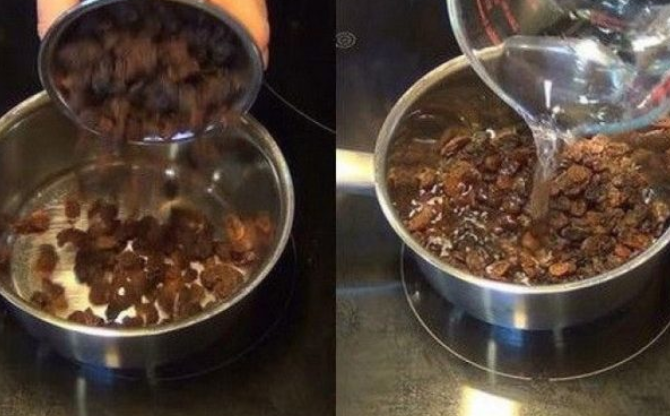 U spremniku koji je hermetičan stavili smo grožđice. U loncu stavite 1 litru filtrirane vode. Zatim ulijte vodu u zdjelu s grožđem. Pusti stajati 24 sata. U hladnjaku.