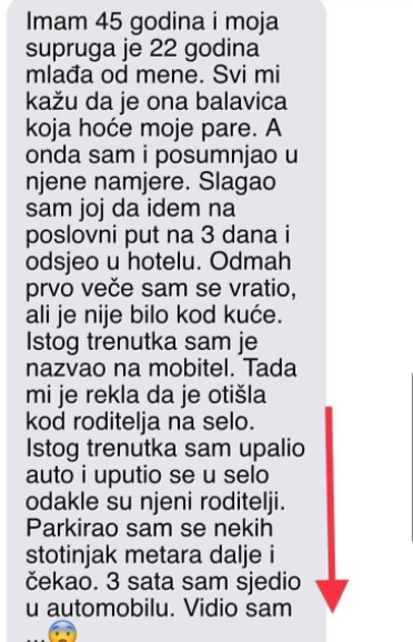 Svi mi kažu da je ona balavica koja hoće moje pare. Toliko su bili uporni da sam u jednom trenutku, iako je beskrajno volim, posumnjao u njene iskrene namjere. Slagao sam joj da idem na poslovni put na 3 dana i odsjeo u obližnjem hotelu.