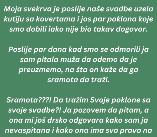 Moja svekrva je poslije naše svadbe uzela kutiju sa kovertama i jos par poklona koje smo dobili iako nije bio takav dogovor. Poslije par dana kad smo se odmorili ja sam pitala muža da odemo da je preuzmemo, na šta on kaže da ga sramota da traži.
