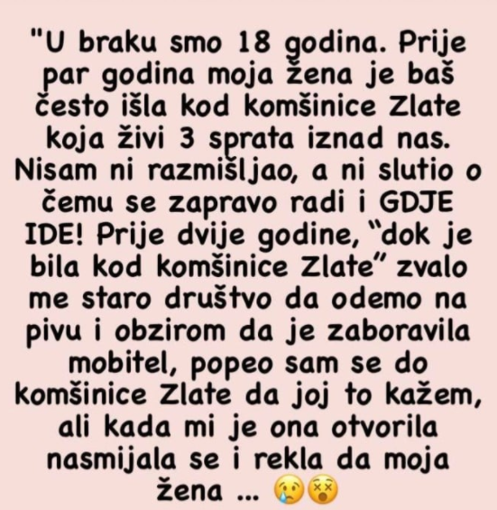 “Ubraku smo 18 godina. Prije par godina moja žena je baš često išla kod komšinice Zlate koja živi 3 sprata iznad nas.Nisam ni razmišljao, a ni slutio o čemu se zapravo radi i GDJE IDE!