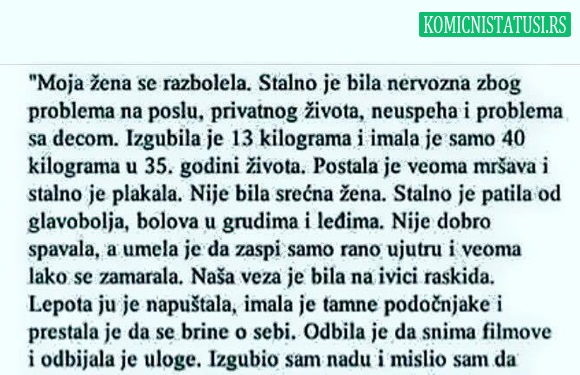 “Moja zena se razbolela. Stalno je bila nervozna zbog problema na poslu, privatnog zivota, neuspeha i problema sa decom. Izgubila je 13kg i imala je samo 40kg u 35-oj godini zivota. Postala je veoma mrsava i stalno je plakala. Nije bila srecna zena. Stalno je patila od glavobolja, bolova u grudima i ledjima.