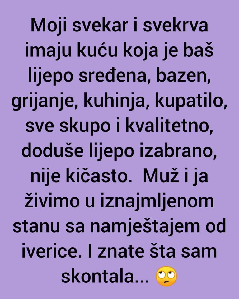 “Moji svekar i svekrva imaju kuću koja je baš lijepo sređena, bazen, grijanje, kuhinja, kupatilo, sve skupo i kvalitetno, doduše lijepo izabrano, nije kičasto.