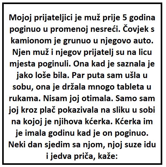 Mojoj prijateljici je muž prije 5 godina poginuo u promenoj nesreći. Čovjek s kamionom je grunuo u njegovo auto. Njen muž i njegov prijatelj su na licu mjesta poginuli. Ona kad je saznala je jako loše bila. Par puta sam ušla u sobu, ona je držala mnogo tableta u rukama. Nisam joj otimala. Samo sam joj kroz plač pokazivala na sliku u sobi na kojoj je njihova kćerka. Kćerka im je imala godinu kad je on poginuo. Neki dan sjedim sa njom, njoj suze idu i jedva priča, kaže: “Ja se i dalje nadam da će on doć u ovu baštu i sjedit sa našom kćerkom ovdje. I ovo jutro sam se probudila misleći o njemu. I ovo popodne ću provest misleci na njega. Zaspat u nadi da ce doć u san. Boli me duša da ona pati punih 5 godina a tek joj je 30.
