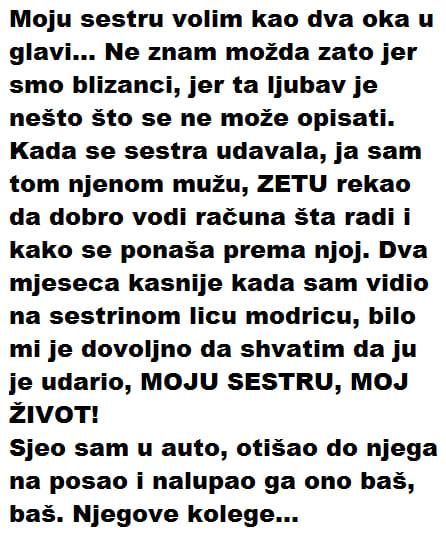 Dva mjeseca kasnije kada sam vidio na sestrinom licu modricu, bilo mi je dovoljno da shvatim da ju je udario, MOJU SESTRU, MOJ ŽIVOT! Sjeo sam u auto, otišao do njega na posao i nalupao ga ono baš, baš. Njegove kolege zvale policiju, mene priveli i da mu kolega nije bilo ko zna kako bi zet završio, ovako ostao je živ.