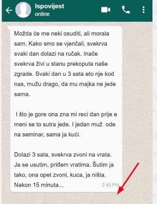 “Možda će me neki osuditi, ali morala sam. Kako smo se vjenčali, svekrva svaki dan dolazi na ručak. Inače svekrva živi u stanu prekoputa naše zgrade. Svaki dan u 3 sata eto nje kod nas, mužu drago, da mu majka ne jede sama. I sto je gore ona zna mi reci dan prije e meni se to sutra jede. I jedan muž ode na seminar, sama ja kući.