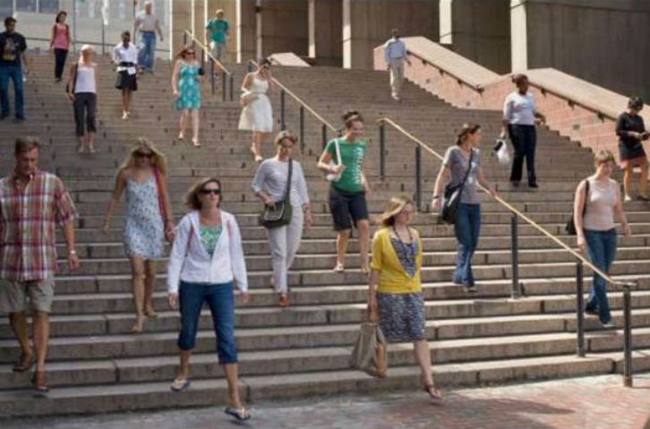 Možete li uočiti šta je neobično na ovoj fotografiji ljudi koji silaze niz stepenice?