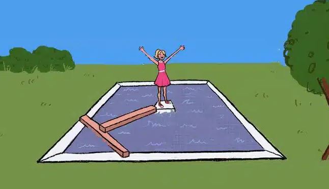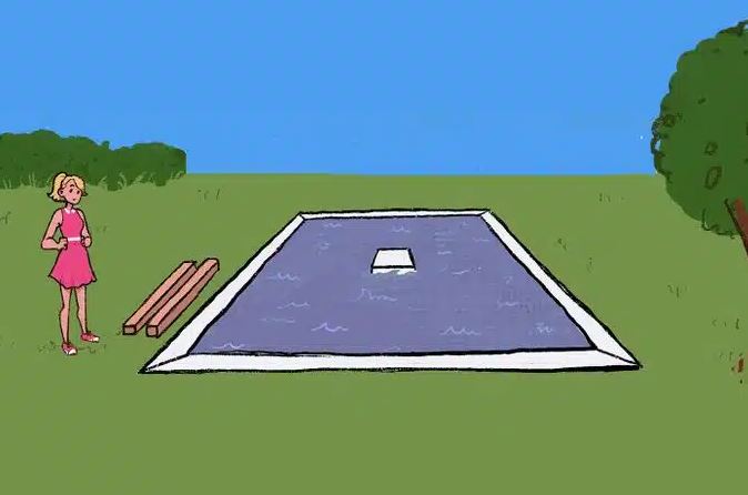 Sanja želi da dođe do otoka u sredini bazena. Svaka ivica bazena je udaljena od otoka 10 metara. Sanja ima dvije drvene grede dužine 9 metara. Kako će Sanja doći do otoka?