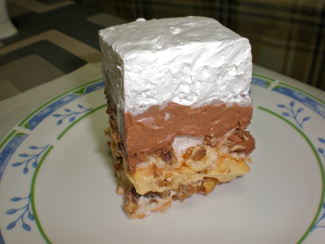 U većoj posudi iznad lonca s vodom zakuhati mlijeko (brže je ako ga prvo zagrijete na otvorenom plamenu pa tek onda prebacite na lonac s vodom kako bi se kuhalo na pari). Miksati žumanjce i šećer, dodati gustin i malo mlijeka (oko 1,5 dl) što ste ostavili od one litre koju ste stavili kuhati pa sve skupa uliti u zakuhalo mlijeko. Miješati kuhačom dok se krema ne skuha. Kada se počne zgušnjavati dobro je kremu izmiksati mikserom jer tako definitivno neće imati grudica i bit će urnebesno podatna. U ohlađenu kremu dodati izrađeni margarin. Podijeliti kremu na dva dijela pa u jedan dio dodati vanilin šećer a u drugi otopljenu čokoladu. Na pladnju za posluživanje slagati jednu beze koru (dio s orasima okrenuti prema gore), premazati žutu kremu, staviti drugu koru, pa premazati smeđom kremom. Sve premazati tučenim slatkim vrhnjem i ukrasiti po želji.