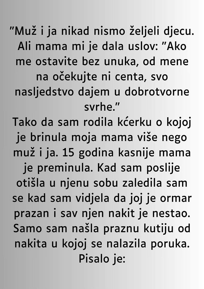 Uopšte nisam shvatala šta se događa. Sve dok nismo pročitali njen testament. Saznali smo da je svo nasljedstvo ostavila mojoj kćerki koje će dobiti kad napuni 18 godina. Za mene ništa. Najgore od svega je što je moja kćerka cijelo vrijeme znala za taj testament.