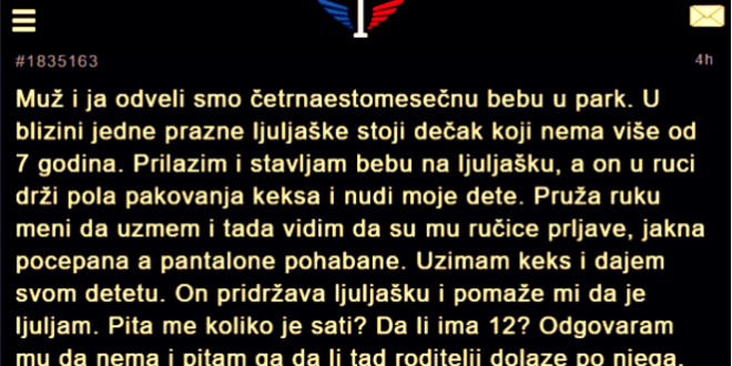 Muž i ja odveli smo četrnaestomesečnu bebu u park. U blizini jedne prazne ljuljaške stoji dečak koji nema više od 7 godina. Prilazim i stavljam bebu na ljuljašku, a on u ruci drži pola pakovanja keksa i nudi moje dete. Pruža ruku meni da uzmem i tada vidim da su mu ručice prljave, jakna pocepana a pantalone pohabane. Uzimam keks i dajem svom detetu.