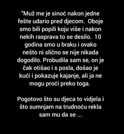 10 godina smo u braku i ovako nešto ni slično se nije nikada dogodilo. Probudila sam se, on je čak otišao i s posla, došao je kući i pokazuje kajanje, ali ja ne mogu proći preko toga.