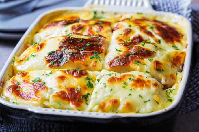 Dublju posudu za pečenje premažite maslacem. Po dnu složite kolutove krompira, zatim dodajte dinstan luk, a zatim opet poređajte krompir i začinite ga biberom i solju. Zatim krompiru dodajte mleko i pavlaku.