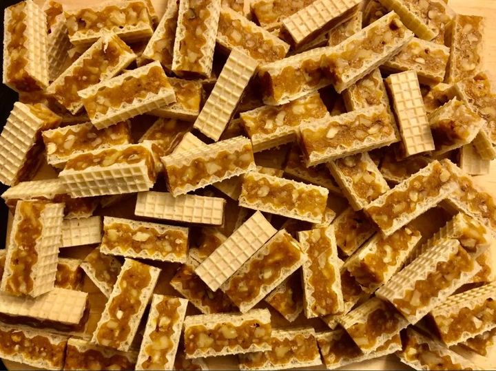Dodati sijeckane orahe i mljeveni keks, dobro izmijesati pa izliti na jedan list oblatne, jednako rasporediti pa poklopiti drugim listom.