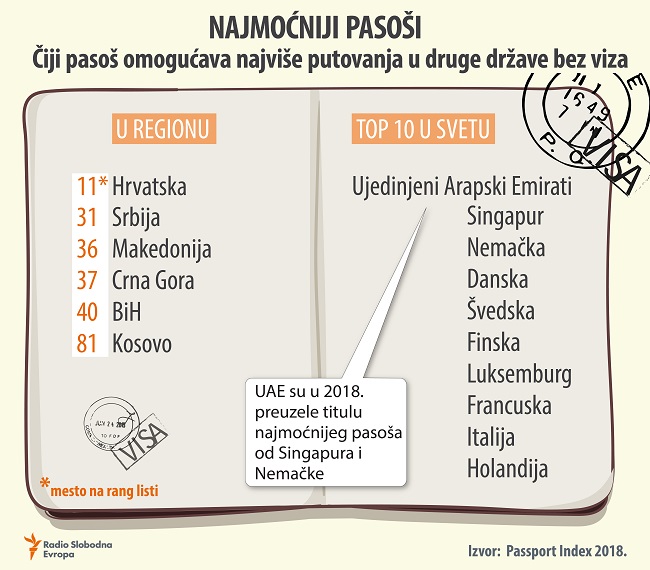 Ujedinjeni Arapski Emirati imaju “najmoćniji” pasoš u svijetu jer sa njim može da se putuje u 167 država sveta bez vize. U regionu se najbolje kotira Hrvatska, najlošije Kosovo.