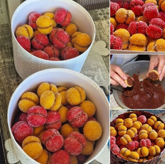 Ohlađene udubine napunite kremom. Spojite dve polovine u breskvu. Sipajte hladnu vodu u činiju. U jednu dodajte ekstrakt jagode, a u drugu ekstrakt kruške. Dobijene breskve lagano potopite u pripremljenu tečnost na kratko, prvo polovinu, pa drugu polovinu. Ne umačite cijelu stvar, samo tijesto. Potopite ih u šećer.