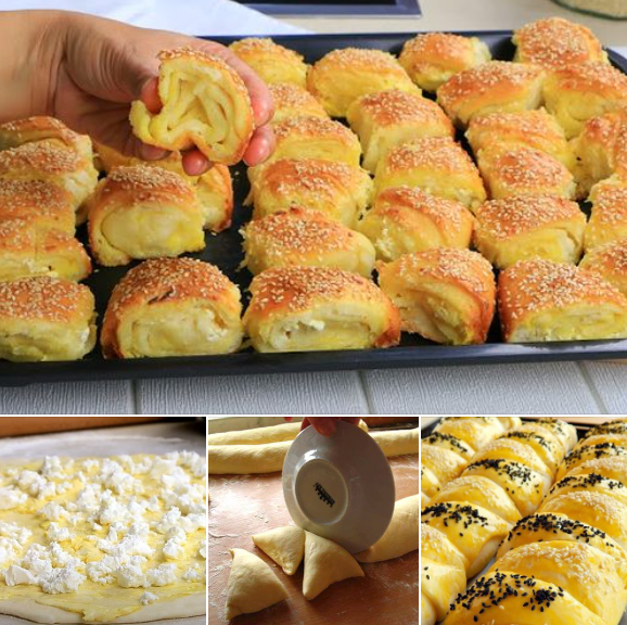 Svaki deo razvucite i filujte umućenim maslacem sa jejetom. Odozgo stavite sir ili šta želite, umotajte i oštrim nožem secite ukoso da dobijete trouglove.Slažite u podmazanu tepsiju i ostavite da stoje oko sat vremena.