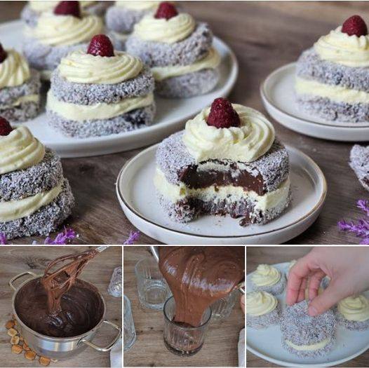 Izvadite tortu iz čaše i uvaljajte je u kokos, pa isecite na 3 koluta. Kolutove stavite na pleh, prelijte zaslađenom pavlakom umućenom sa vanilijom i prelijte preostalim kolutovima čokolade. Ponovo sipajte šlag, ukrasite po želji i poslužite.