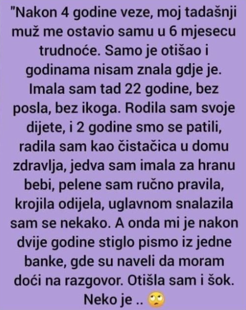 “Nakon 4 godine veze, moj tadašnji muž me ostavio samu u 6 mjesecu trudnoće. Samo je otišao i godinama nisam znala gdje je. Imala sam tad 22 godine, bez posla, bez ikoga.Rodila sam svoje dijete, i 2 godine smo se patili, radila sam kao čistačica u domu zdravlja, jedva sam imala za hranu bebi, pelene sam ručno pravila, krojila odijela, uglavnom snalazila sam se nekako. A onda mi je nakon dvije godine stiglo pismo iz jedne banke, gde su naveli da moram doći na razgovor. Otišla sam i šok.