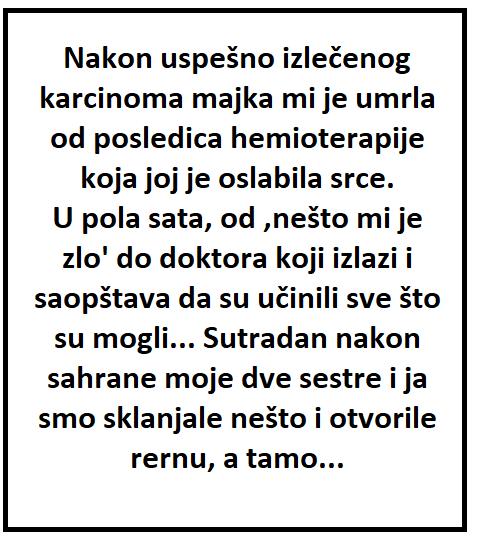 Nakon uspešno izlečenog karcinoma majka mi je umrla od posledica hemioterapije koja joj je oslabila srce. U pola sata, od ,nešto mi je zlo’ do doktora koji izlazi i saopštava da su učinili sve što su mogli… Sutradan nakon sahrane moje dve sestre i ja smo sklanjale nešto i otvorile rernu, a tamo- rolat sa pekmezom koji je tati pravila jer ga je volio. Zagrlile smo se i plakale satima.. Naša divna majka, i kad je bolelo mislila je da nama ugodi..