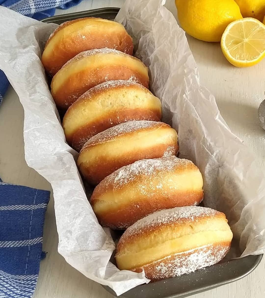 3.Dobivenu smjesu ostavite na toplom dok se ne udvostruči, potom je prebacite na pobrašnjenu površinu i razvaljajte na debljinu 1 cm. Okruglim kalupom izrezujte oblike i kada ste iskoristili cijelu smjesu, ostavite da se dobiveni oblici uzdignu. Potom ih okrenite na drugu stranu da se i ona diže.4.Lonac napunite uljem i zagrijte (ulje treba biti vrelo, nikako pregrijano na takvo će vas upozoriti stvaranje mjehurića). Krafne sada stavljajte u zagrijano ulje i pazite da je prva strana koja se podizala okrenuta prema gore. Smanjite vatru i poklopite poklopcem, nakon 2 do 3 minute uklonite poklopac i okrenite krafnu na drugu stranu da se prži, ali bez pokrivanja poklopcem (na ovaj načina po sredini krafne nastaje bijela crta baš poput originalnog izgleda).5.Špricaljku za kreme napunite pekmezom i punite krafne nakon što ste ih složili na papirnate kuhinjske ubruse.