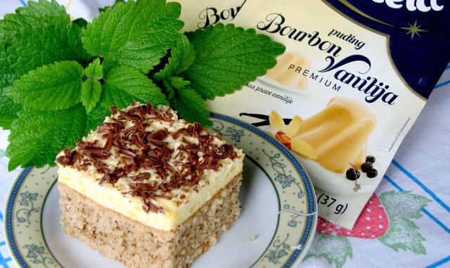 Krema:2 pudinga od vanile,6 kašika šećera,600 ml mlijeka,20 grama maslaca.I još:naribana čokolada za posipanje.