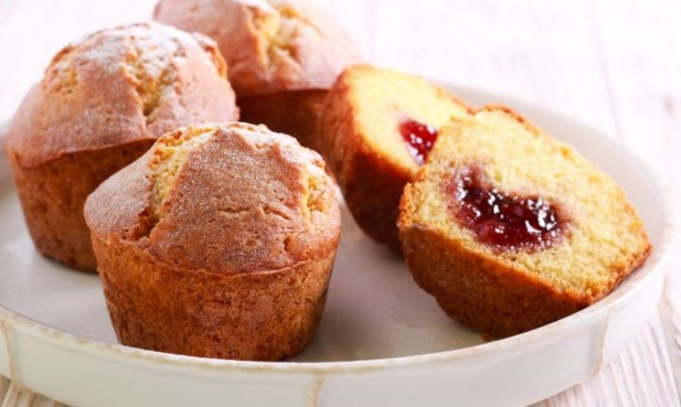 U kalup za mafine stavite papirne korpice, pa svaku napunite smesom do pola, stavite džem po izboru, pa napunite smesom gotovo do vrha. Pecite u zagrejanoj rerni na 180 stepeni, oko 20 minuta dok mafini lepo ne porumene. Pečene i ohlađene mafine pospite šećerom u prahu.