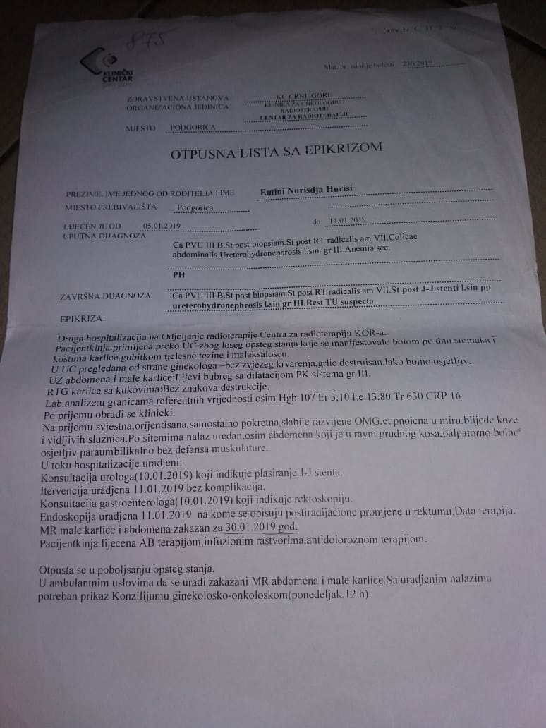 Huriša Emini iz Prizrena, rođena: 04. maja, 1974. godine koja trenutno živi u Podgorici u Crnoj Gori, oboljela je od karcinoma grlića materice koji je nažalost u svom IV stadijumu.