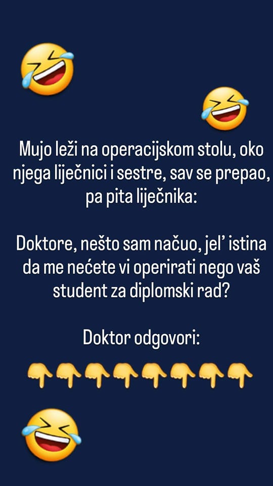 Doktore, nešto sam načuo, jel’ istina da me nećete vi operirati nego vaš student za diplomski rad?