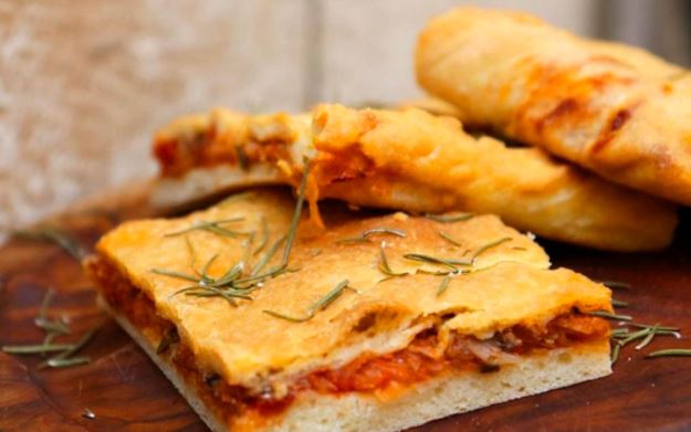 Pirjajte na laganoj vatri, a kad umak bude gotov, stavite ga sa strane da se ohladi. Kad se tijestu udvostruči volumen, podijelite ga na dva dijela. Razvaljajte ga na debljinu 1,5 cm i stavite na nauljeni lim da prelazi preko ruba. Na tijesto stavite pripremljeni nadjev pa posložite slane inćune i prekrijte drugom polovicom tijesta.