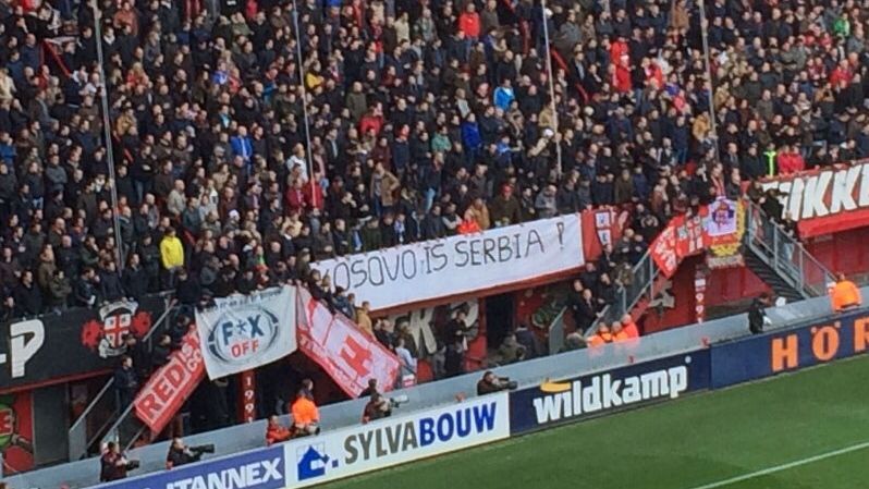 Navijači fudbalskog kluba Twente razvili su danas na utakmici svog kluba protiv Feyenoorda transparent s natpisom “Kosovo je Srbija”, zbog čega klubu prijeti kazna pošto UEFA-a zabranjuje izražavanje bilo kakvih političkih stavova na stadionima.