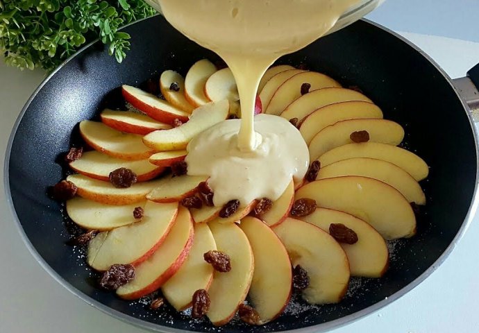 Sastojci:1 jabuka,sok od pola limuna,1 jaje,8 g vanilin šećera,prstohvat soli,2 žlice šećera,200 ml mlijeka,2 žlice ulja,160 g brašna,8 g praška za pecivo.
