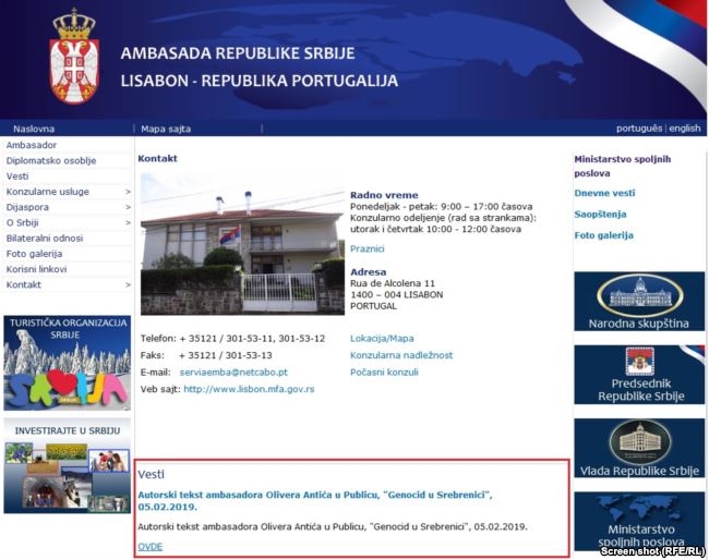 Ovaj tekst nalazi se na zvaničnoj internet stranici Ambasade Srbije u Portugalu. Radio Slobodna Evropa zatražio je komentar o ovom slučaju od Ministarstva spoljnih poslova, ali do zaključenja ovog teksta nismo dobili odgovor. Takođe, sporni tekst ni u četvrtak 14. februara nije povučen sa zvanične internet stranice Ambasade Srbije u Lisabonu, odnosno Ministarstva inostranih poslova.