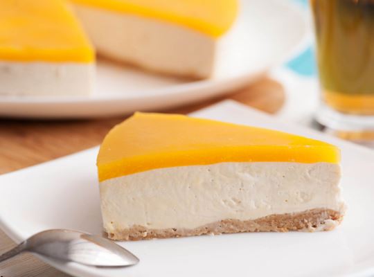 Sameljite kekse, dodajte rastopljeni maslac i žlicu kokosova brašna. Smjesu od keksa ravnomjerno rasporedite u kalup obložen papirom za pečenje (dno) i dobro utisnite te spremite u hladnjak. Za kremu od manga očistite mango te ga izblendajte u pire. Pire od manga stavite u posudu na vatru, dodajte mu šećer i sok od limuna. Miješajte 5 – 10 minuta dok se šećer ne otopi. U hladnu vodu potopite jedan po jedan listić želatine.