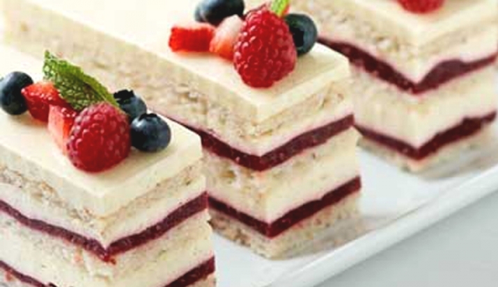 Jednu koru od badema izrežite na dimenzije kalupa i stavite na dno. Isto učinite i sa želeom od maline pa stavite preko prve kore, a žele premažite sa malo manje od polovine bavarske kreme.