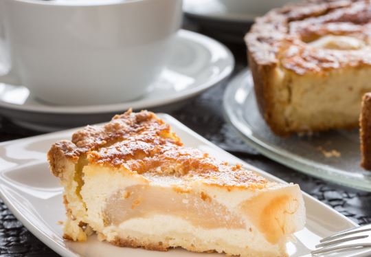 Izlijte polovicu tijesta u pripremljeni kalup i ravnomjerno ga rasporedite. Preko tijesta posložite pirjane kruške tako da prekriju cijelu površinu. Preostalo tijesto izlijte preko krušaka i pokušajte ga ravnomjerno rasporediti. Pecite u zagrijanoj pećnici oko 35-40 minuta ili dok kolač ne postane lijepe zlatnosmeđe boje. Kad se ohladi, možete ga posuti šećerom u prahu ili poslužiti uz kuglu sladoleda ili šlag.