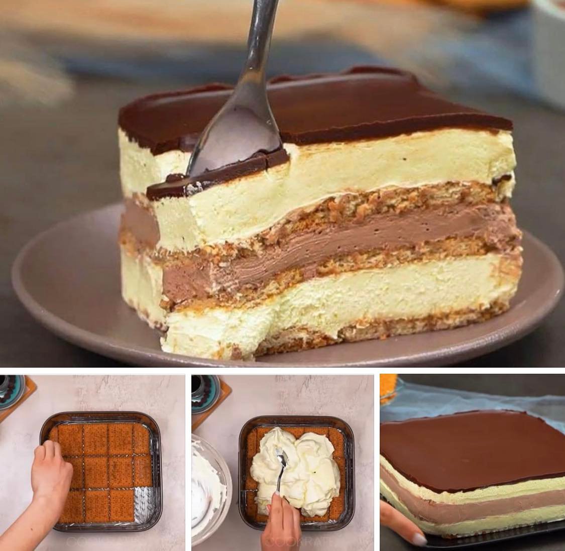 U 150 ml mleka rastvoriti neskvik pa umakati keks. Četvrtast pleh obložite providnom folijom pa ređajte keks po dnu. U šerpu stavite prašak za puding, jaja, šećer, mleko. Promešajte žicom i stavite da se zagreva dok ne počne da se zgušnjava. Zatim sklonite sa ringle, ubacite puter i umutite. zatim dodajte i umućen šlag pa sve umutite mikserom da se dobro sjedini. Podelite fil na dva dela i u jedan umešajte rastvoren neskvik u mleku ili vodi. Preko keksa stavite pola belog fila, poravnajte. Još jedan red keksa pa neskvik fil. Zatim još jedan red keksa i ostatak belog fila. Stavite u frižider na sat vremena. Nakon toga rastopite čokoladu za glazuru i prelijte tortu. Vratite u frižider na još pola sata.