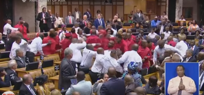 Članovi radikalne partije ”Borci za ekonomsku slobodu” (EFF), svi obučeni u crveno sa beretkama na glavama, potukli su se sa obezbjeđenjem u južnoafričkom parlamentu koji su ih izbacili iz te ustanove, jer su ometali predsjednika države Džejkoba Zumu kada je pokušao da predstavi Stanje nacije.