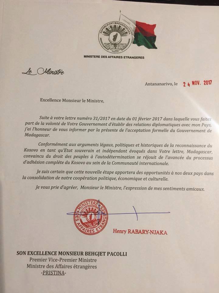 Nezavisnost Kosova je danas priznala još jedna zemlja. Riječ je o Madagaskaru koji je večeras zvanično priznao Kosovo, rekao je ministar spoljnih poslova Kosova Behgjet Pacolli.