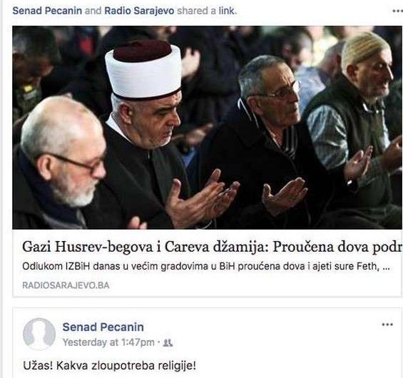 Šta je to u riječima: “Uzvišeni, pomozi one koji se na Tvom putu bore kako bi donijeli mir među napaćene muslimane Šama. Bože, zaštiti obespravljene i nemoćne, zaštiti tamošnje narode od terora i skupina onih koji se ne drže Tvojih propisa” i “Bože naš, sačuvaj ovu našu zemlju od svakog zla. Sačuvaj od zla i sve zemlje svijeta. Učini da mir zavlada u srcima ljudi i pomozi našoj braći u Turskoj, Siriji, Palestini i na svakom mjestu. Amin!” toliko pogrešno pa da izazove ovakvu reakciju Senada Pećanina i kako je moguće da je vjerničko upućivanje molitve Bogu ustvari “zloupotreba religije”, zna valjda najbolje Senad Pećanin.