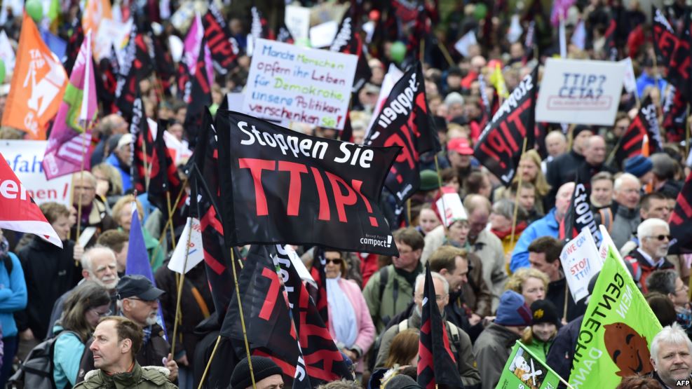 Demonstranti su se okupili danas u Berlinu, Hamburgu, Kelnu i Frankfurtu nakon što je ministar ekonomije Njemačke Zigmar Gabrijel rekao prošlog mjeseca da su pregovori o TTIP-u de fakto propali, iako to niko još neće da prizna.