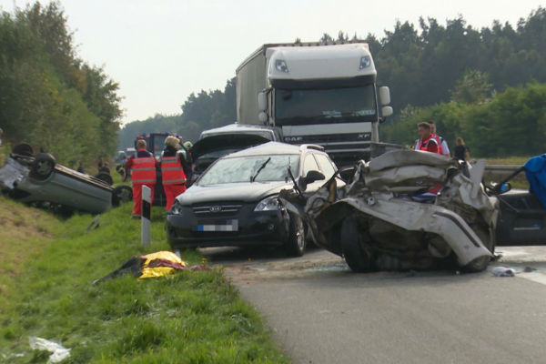 Vozač kamiona previdio je kolonu zaustavljenih automobila i punom brzinom zabio se u njih. Brojni automobili su potpuno uništeni, a jedan je izgorio.