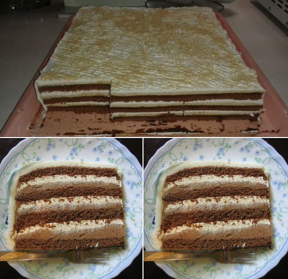 3.Ređamo na podmazan posluzavnik: Kora (kvasiti je sa čokoladnim mlekom ), fil 1, fil 2. I tako još dva puta. Preko posuti sa malo ml plazme.