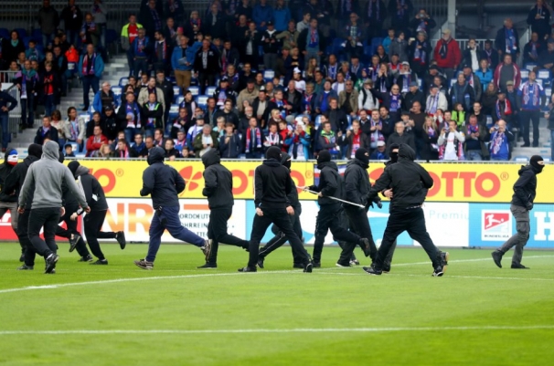 Prije utakmice sedmog kola njemačke Cvajte između Holstein Kiela i St. Paulija, grupa domaćih huligana utrčala je na travnjak i krenula u obračun sa navijačima protivničkog tima.