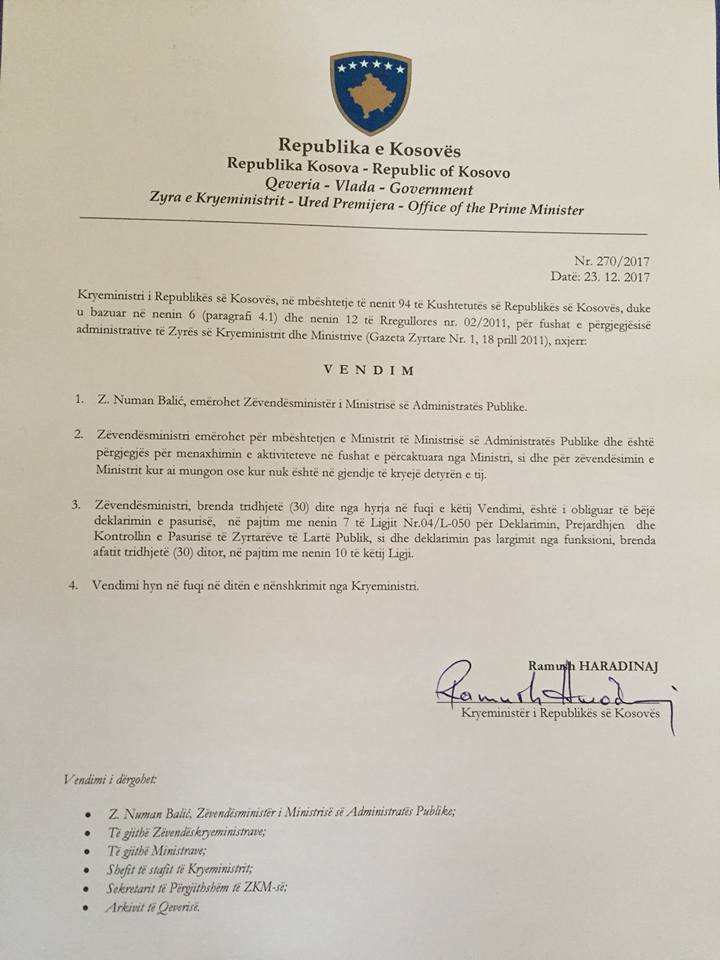 “Na današnjem sastanku u uredu premijera, predsjednik Vlade Kosova, Ramush Haradinaj donio je odluku o imenovanju Numana Balića za zamjenika ministra u Ministarstvu javnu administraciju”, navodi se u saopštenju.