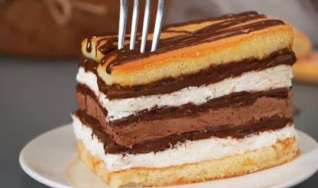 Podelite smesu na 2 dela i u jedan dodajte nutelu (150 g), a u drugi istopljenu belu čokoladu. Ređajte: beli fil, nutela, crni fil, nutela, beli fil, nutela, crni fil, nutela i na kraju piškote.