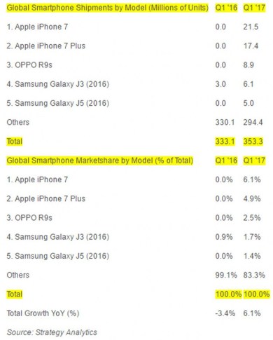 Strategy Analytics je danas izašao s rezultatima istraživanja koji prikazuju pet najprodavanijih smartfona u prvom kvartalu ove godine. Očekivano, pobjedu je odnio Apple sa svojim iPhoneom 7, koji je u prodan u 21,7 miliona primjeraka, što čini 6,1% od ukupno 353 miliona smartfona prodanih u ovom razdoblju.